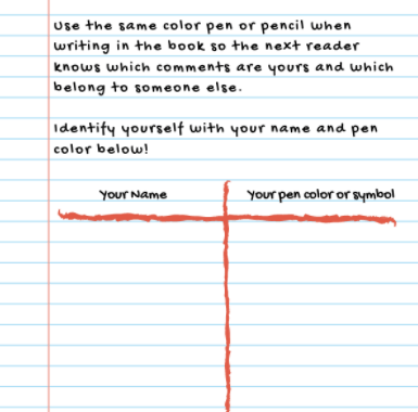 The second label I created was a space where each student could write their name down so other students knew who had the books before them and who the thoughts and pictures were connected to. I wanted to make reading social, and by putting a name to the thoughts and ideas in the books, our kids could start interacting with each other.
