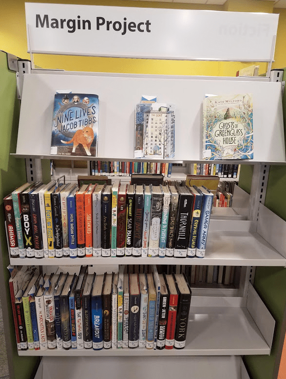I love a great theatrical reveal, so the whole time Jen and I were working on this, we had the shelf covered in bulletin board paper to gain interest. When we were finally ready, I dramatically ripped off the paper and revealed it at a staff meeting to everyone at once. I brought in some of the books so they had a chance to read the labels and ask questions. One of the main rules we decided on was that they could only have 1 Margin Project book checked out at a time to ensure that everyone had a chance.
