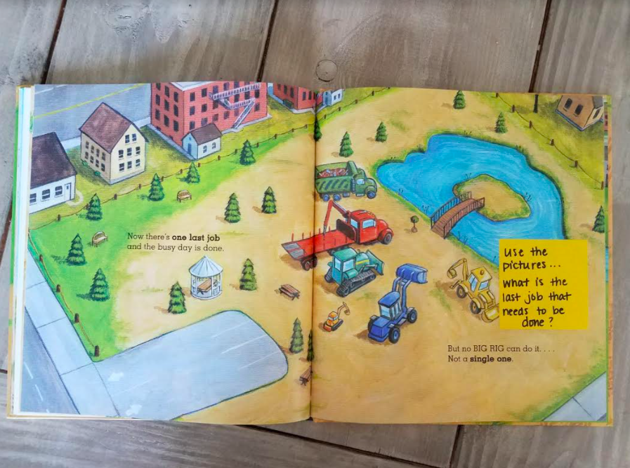 Lastly, picture books are amazing for working on making inferences. The illustrations are usually so rich and full of clues that readers can use to make an inference. In this specific case the text is saying “there’s one last job”. Readers need to look closely at the pictures and think about what they already know to figure out what that job would be.