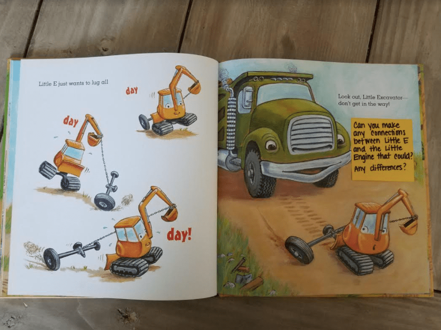 Another great teaching opportunity, that’s very “Common Core”, is comparing this story to another story. As I was reading, I couldn’t help but think about The Little Engine that Could. The plot is similar and the main characters are very similar. Reading both stories and then engaging in a discussion while comparing and contrasting the two would cover many aspects of the standards. You could choose to use a traditional venn diagram or a t-chart to model how to organize their thinking when comparing two different things.
