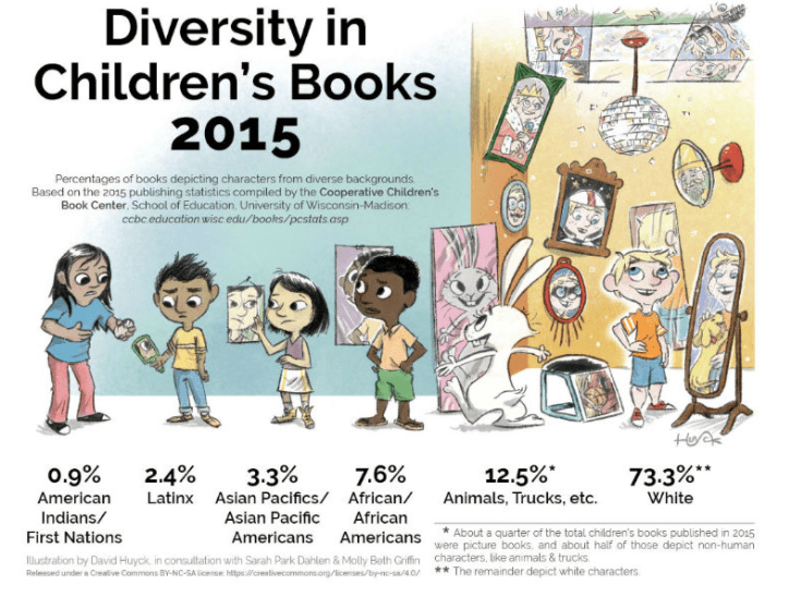 Now, imagine being a latinx student; of those 100 books, you found 5 with a character that looks like you. Native American student? 1 out of 100 books has a character that looks like you.