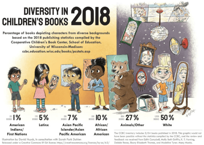 I first saw this graphic at a Donalyn Miller event I attended a couple of years ago. I remember when she projected it, and explained that out of the 3,100 children’s books that were published in 2018, these are the percentages of each ethnicity that was represented as a main character. I wish I could say that I was completely shocked and taken aback, but as someone who’s been an avid reader since grade school, sadly, these percentages seemed right to me.