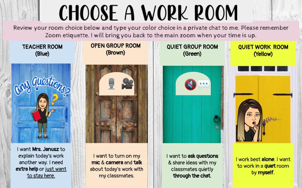 One way to give students some choice in how they like to work is to utilize a choice board like mine below. After a whole group lesson, share this image with your class and have the type in the chat box which color room they would like to join during independent work time. Based on their responses, you can quickly form breakout rooms to accomodate their choices (if they choose yellow, it requires individual rooms so they are by themselves).