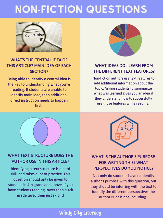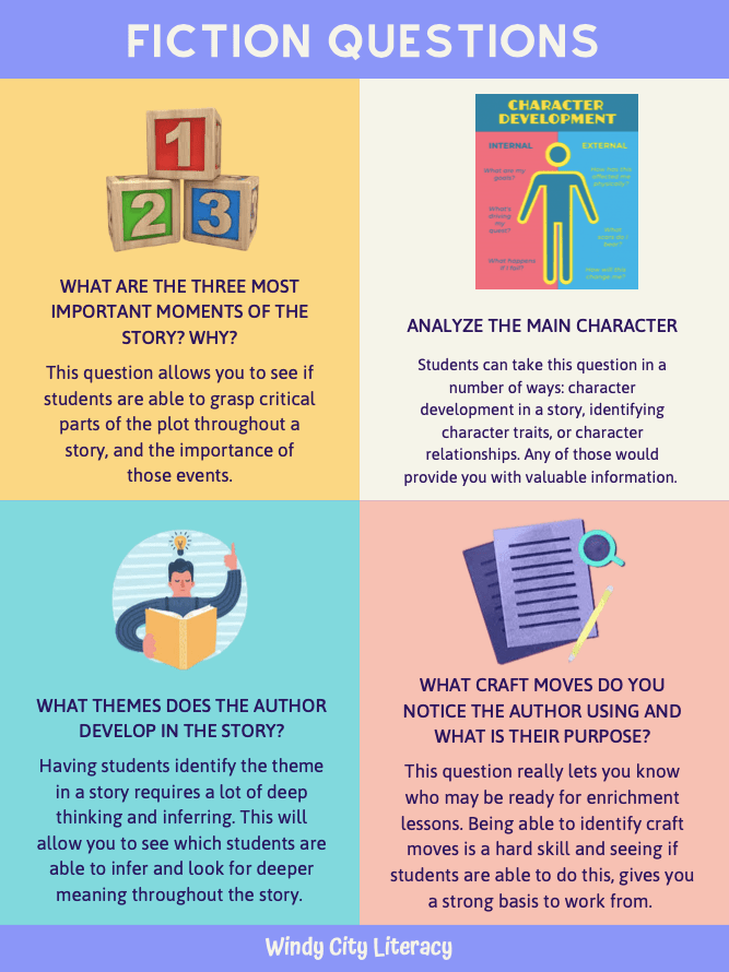 I’ve come up with 8 questions that can be used for any text you pick (4 for fiction and 4 for non-fiction). These questions were created with the purpose of being able to determine different areas of need for your students. They will be assessing all the core components of comprehension: characters, theme, plot, and author’s craft. (Click on the picture to download your FREE copy!)
